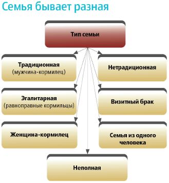 Говоря о новых возможностях женщины, не будем забывать о том, что семья все равно занимает важное, если не важнейшее место среди них. Правда, в сравнении с ситуацией 30-40-летней давности сегодня наблюдается тенденция к диверсификации типов семей (схема «Семья бывает разная»). В современной России женщина может выбрать себе наиболее комфортный семейный статус в соответствии с потребностями, амбициями, притязаниями и т.п.