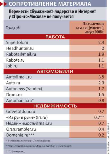 Атака в онлайне «Пронто-Москва» стартовала в прошлом году с трех главных тем: машины, квартиры и работа. Ведь они обеспечивают изданиям холдинга 92% выручки (44% приходится на автомобили, 40% на недвижимость, 6% на работу). Началось с переделки сайта по поиску работы job.ru, по посещаемости отстающего от лидеров superjob.ru и headhunter.ru примерно вдвое. Но «Пронто», потративший на перестройку job.ru $1 млн, думал не о посещаемости, а о доходах. Бизнес-модель ресурса поменялась кардинально теперь он, как и его соседи в рейтинге, зарабатывает не только на баннерах, но и на кадровиках, которые платят за доступ к базе резюме. За прошлый год сайт принес $3,3 млн, более чем в 2 раза отстав от headhunter, но уже в этом году, по замыслу Сергея Орехова, оборот должен удвоиться благодаря переходу с рекламной на сервисную бизнес-модель. Однако на посещаемости переделки не сказались: в последние два года она не растет. К тому же некоторые работодатели недовольны: «В последнее время job.ru очень испортился, подписка стала платной, система глючит, резюме приходят нечитаемые. Раньше тут можно было найти неплохих IT-специалистов, а теперь уже нет», жалуется Мария Горпенко, ведущий специалист по управлению персоналом Промсвязьбанка, помимо job.ru пользующаяся еще четырьмя кадровыми сайтами.