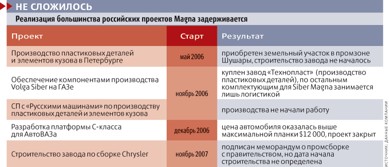 Magna, уступающая по объемам производства в своем сегменте лишь японской Denso и немецкой Robert Bosch, сотрудничает с десятком автомобильных фирм по всему миру. Канадцы изготавливают обширную гамму запчастей, а также собирают автомобили на своем австрийском заводе для BMW, Mercedes, Chrysler. На Россию Magna, штаб-квартира которой находится в Торонто, а бизнес сосредоточен в Северной Америке и Западной Европе, обратила внимание в самом начале 2006 г. И было отчего: к тому моменту уже стало очевидно, что бурный рост спроса на иностранные автомобили в России явление не случайное и автомобильный рынок в нашей стране будет расти быстрее, чем даже в Китае. Согласно вышедшему в 2007 г. исследованию J. D. Power & Associates, к 2012 г. производство автомобилей в России должно вырасти почти на 90%, в то время как в Китае на 77%. США и Западной Европе до этого далеко: за те же шесть лет автопроизводство там, по мнению J. D. Power, должно увеличиться лишь на 8 и 5% соответственно. Так Россия или Китай? Китай дальше от существующих заводов Magna, да и работать там фирме казалось сложнее, чем в России, признавался в одном из интервью содиректор Magna Зигфрид Вольф. Выбор был сделан. Но действительность сильно разошлась с наблюдаемой из-за океана статистикой.