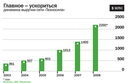 Казалось бы, сходство с "Эльдорадо" не слишком вредило "Техносиле". Начиная с 2003 года выручка сети неуклонно росла (см. график на стр. ??????). Однако не настолько, как хотелось владельцам. В 2007 году она прибавила на 38,3% по сравнению с предыдущим — больше, чем у "Мира" (19%), но меньше, чем у "М.Видео" (52%) и "Эльдорадо" (46%).