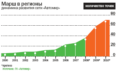В конце 2005 года открылся первый автосалон в Санкт-Петербурге. В 2006-м компания вышла на рынки Брянска, Самары, Воронежа и Ярославля. В 2007-м "Автомир" объявил, что в ближайшие три года потратит $200 млн заемных средств на открытие еще 30 региональных автосалонов в придачу к имеющимся (их было уже больше двух десятков). Компания поставила перед собой цель получать более половины выручки за пределами двух столиц. В 2008 году планы "Автомира" стали еще более грандиозными. На них не повлиял даже финансовый кризис, по крайней мере пока: к 2010 году компания хочет иметь в своем составе 71 дилерский центр.