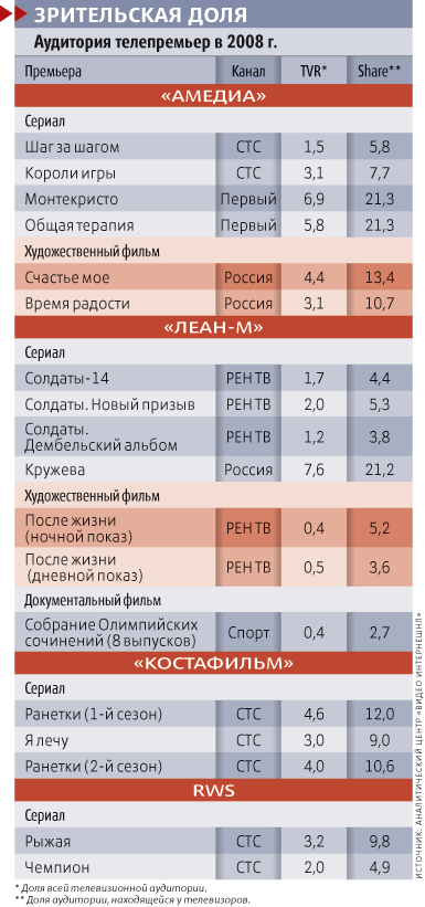 Большая часть вложенных Блаватником $45 млн пошла на создание студии в цехах бывшего подшипникового завода на Новоостаповской улице. К 2007 г. там собирались построить 14 павильонов. Но и по сей день два не достроены, а оборудование четырех не завершено. Дело в том, что с 2006 г. стремительный рост «Амедиа» замедлился. Этим летом абсолютного лидера на рынке сериалов, объем которого глава «Амедиа» оценивает в $400 млн, уже не было. Ни у самой «Амедиа», ни у ее главных конкурентов «Леан-М», «Стар Медиа», RWS нет доли больше 18-20%, уверен Акопов.
