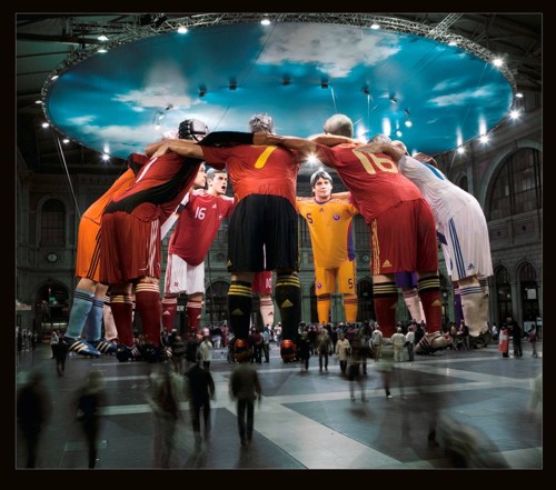 Хорошая иллюстрация принципов Media Arts – работа для Adidas, которые TBWA сделали в Цюрихе. Impossible is nothing («Невозможное возможно») – заявляет бренд. Значит, явление бренда народу должно быть невозможным, невероятным! У людей есть фотокамеры в телефонах? Значит, надо дать пищу фотокамерам. TBWA создали 17-метровый в высоту, 33-метровый в ширину круг из 11 лучших футбольных игроков и поставили его в одном из самых посещаемый мест Цюриха – в главном зале Центрального вокзала. Почему круг? Ну, есть такой магический момент в футболе, когда игроки перед игрой кладут руки друг другу на плечи, чтобы ощутить единство команды.