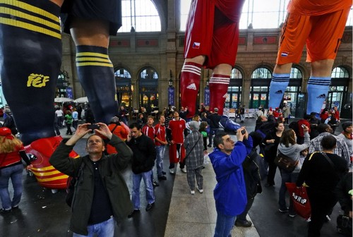 Были изготовлены огромные фигуры – в 10 раз выше, чем фигуры из Музея мадам Тюссо. Они делались со всем вниманием к деталям и перевозились по частям: одна кроссовка (естественно, марки Аdidas) занимала целую грузовую автомобильную платформу! Над кругом из исполинских игроков, установленных в зале вокзала, был устроен подвесной потолок, имитирующий голубое небо с облаками, по периметру этого потолка были укреплены прожекторы со стадиона. Зайдя внутрь этого круга, вы получали потрясающее ощущение нахождения в величественном месте, рядом с невероятными людьми. Естественно, все люди делали то, что и было запланировано: они клали на пол мобильные телефоны и тоже становились в круг, меньший, чтобы сделать фото. Говоря научным языком, TBWA предоставили людям желанный контент для медийного пространства.