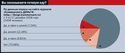 Для крупных игроков ситуация также не слишком приятна, хотя на вопросы о кризисе они предпочитают отвечать уклончиво. Да, падают дневные продажи — работники средних и больших офисов, составлявшие львиную долю прироста спроса в последние годы, отказываются от доставки еды. Зато заказы на дом практически не потеряли в объеме. И вообще, самые серьезные потери в этом году, по признанию компаний, связаны не с падением ежедневного спроса, а с отменой корпоративных празднеств. Привычной вакханалии предновогодних заказов не ожидается, а на них, по различным оценкам, в прежние годы приходилось до 10% годовой выручки.