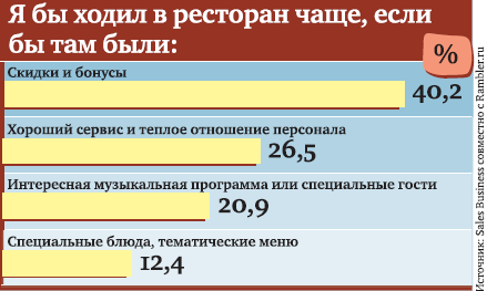Эффект маркетинговых усилий обернулся реальным финансовым результатом и для «Япоши». «Нам достаточ-но акцентировать внимание потенциальной ауди-тории на своих ценах, которые до сих пор остаются самы-ми доступными в сегменте демократичных ресторанов, – рассказывает заместитель генерального директора сети Роман Гройсберг. – Но в январе 2009 года, в период посленовогоднего спада, мы решили провести традиционную акцию «Вторая суши в подарок». Суть ее заключается в том, что в ресторанах «Япоша» по всей стране каждый гость, заказывающий суши, получает в подарок еще одну такую же порцию. А вот дорогим ресторанам значительно сложнее». В этом году, по мнению специалистов сети, акция имела значительно больший резонанс, чем в прошлом. Благодаря ей удалось привлечь внушительное число новых посетителей и обороты в январе превысили показатели декабря на 25 процентов. Стало понятно, что сейчас потребители более чувствительны к цене, чем в прошлом году. Как показал совместный опрос SB и Rambler.ru, для посетителей ресторанов скидки и бонусы имеют приоритетное значение.