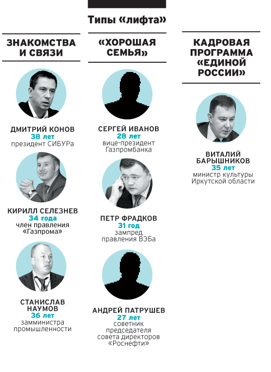 «В том же ЛУКОЙЛе карьерный рост замедленный, он примерно как в западных компаниях, говорит председатель совета директоров Ward Howell Сергей Воробьев. При этом компания берет топ-менеджеров со стороны». Это, например, Андрей Кузяев из Перми или Александр Матыцын из аудиторской компании KPMG. А вот в руководство «» профессионалу со стороны попасть невозможно. «У нас элита молодая и агрессивная. Для нее требование безопасности чтобы человек был своим, надежным зачастую на первом месте, а уровень компетентности на втором», говорит гендиректор ВЦИОМ Валерий Федоров. Вот, например, 34-летний член правления «Газпрома» Кирилл Селезнев. В столь юном возрасте он руководит двумя ключевыми бизнесами монополии продажей газа на внутреннем рынке и электроэнергетикой. Впрочем, он не только сын бывшего председателя Госдумы Геннадия Селезнева, но еще и менеджер, сумевший, по оценкам собеседников