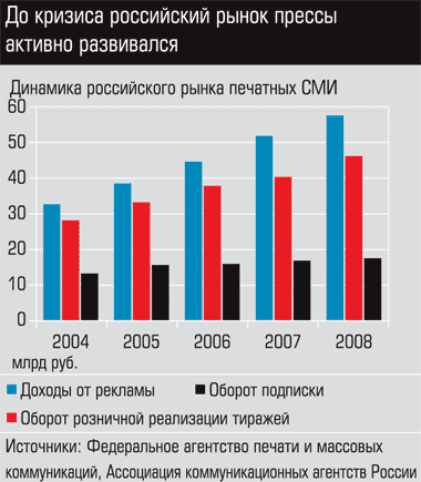 С 2003 года в России начал бурно расти рекламный рынок, что послужило импульсом к развитию рынка прессы и, соответственно, ее дистрибуции. Появились как крупные федеральные игроки - ОАО "Роспечать", "Наша пресса", "ДМ Пресс", "Центр дистрибуции прессы", "Ариа-АиФ", так и региональные - "АРПИ-Сибирь", "Нева-пресс", "Прессбург", имеющие розничные сети киосков или работающие с супермаркетами. Многие издательства также включились в этот процесс и активно наращивали собственные дистрибуцию и розницу. Рынок прессы ежегодно увеличивался на 18-20%, и к 2008 году его размер достиг примерно 2,5 млрд долларов.