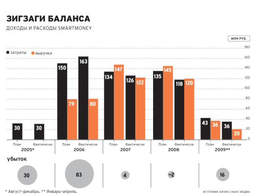 По данным аналитического центра "Видео Интернешнл", рекламные доходы деловых еженедельников в I квартале 2009 г. в целом снизились по сравнению с аналогичным периодом прошлого года вдвое - до 300 млн руб. В конце апреля в SmartMoney было забукировано лишь 10% бюджета на май. За первые четыре месяца 2009 г. выручка SmartMoney составила 20 млн руб. Выпуск обходится почти вдвое дороже. Кризис поставил крест на всех попытках сделать журнал рентабельным. В 2008 г. в соответствии с бизнес-планом еженедельник вышел в плюс, получив пусть и сравнительно небольшую, но все-таки прибыль - 2 млн руб. Достигнуто это было благодаря сокращению расходов: выручка прошлого года (120 млн руб.) была меньше, чем в 2007 г. Если бы рынок стагнировал или падал не так сильно, с таким уровнем затрат еженедельник продолжал бы существовать в плюсе. Но рынок упал двукратно, а сокращать расходы дальше было уже некуда. После майских праздников гендиректор БНМ Михаил Дубик подтвердил СМИ, что на этот раз слухи о закрытии проекта, которые циркулировали на рынке все три года, что просуществовал журнал, - правда.