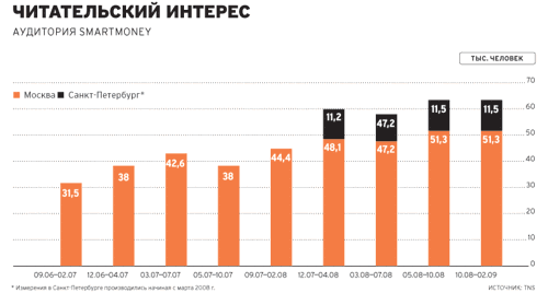 В конце 2007 г. аудитория SmartMoney наконец превысила тираж: по данным TNS Gallup, она составила в Москве и Санкт-Петербурге почти 60 000 человек. К концу прошлого года к ним добавились еще 10 000 человек. Сумел бы он со временем догнать и перегнать "Эксперт" и "Деньги"? "Проект был неудачен с самого начала и не попал в аудиторию ни сначала, ни позднее", - категоричен генеральный директор медиахолдинга "Эксперт" Валерий Фадеев. По мнению главного редактора Forbes Максима Кашулинского, журнал был слишком эклектичен, в нем перемешивались тексты и про частные инвестиции, и про макроэкономику, и про науку - хорошие сами по себе, все вместе они размывали концепцию. "В журнале действительно были хорошие тексты, но это не значит, что это был хороший журнал, - соглашается Дерк Сауэр. - свой собственный тон мы нашли только в последнее время".