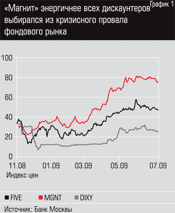Все это — результат оптимизации бизнеса, которая позволила «Магниту» в момент кризисного падения фондового рынка оттолкнуться от дна сильнее других розничных компаний и продемонстрировать опережающий рост курса акций. Бумаги сети выросли с января по июль 2009 года на 130%, тогда как у лидера рынка, X5 Retail Group (владеет сетью «Пятерочка»), только на 69% (см. график 1).