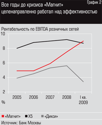 По мнению экспертов, выделяется «Магнит» среди ритейлеров и растущей эффективностью бизнеса. Рентабельность сети по EBITDA увеличилась с 5% в 2005 году до 9% в первом квартале 2009?го, тогда как у X5 за такой же период она практически не изменилась и сегодня составляет 8,7%. Третья крупная сеть дискаунтеров, «Дикси», показывала незначительный рост эффективности до кризиса (с 4 до 5,6%), но в кризис упала до 3,4% (см. график 2).