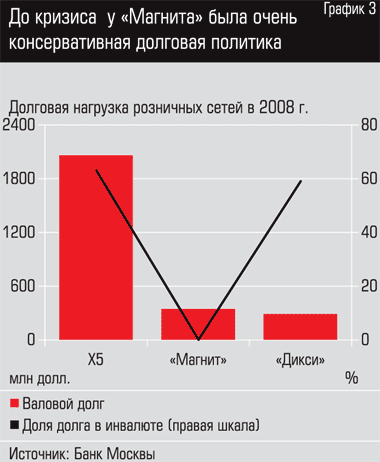 Одним из источников роста акций «Магнита» в кризис и — одновременно — показателем стратегической дальновидности Сергея Галицкого стала низкая долговая нагрузка при полном отсутствии валютного долга. Так, по мнению аналитиков, более низкие темпы роста котировок акций X5, чем «Магнита», объясняются именно долговой нагрузкой X5, преимущественно валютной. Поскольку у «Магнита» практически нет долгов, к нему благосклонны и банки. В начале июля «Сосьете Женераль Восток» (BSGV) открыл компании возобновляемую кредитную линию на 1 млрд рублей сроком на год. У других сетей источником кредита в период кризиса являются только госбанки.
