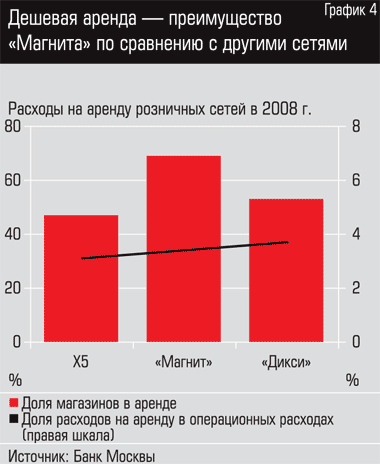Выбор провинции приоритетным направлением экспансии дал «Магниту» преимущество по денежным и временным затратам на открытие магазинов. В любом крупном городе аренда площадей до кризиса стоила недешево. Например, X5, имея всего 47% площадей в аренде против 70% у «Магнита», расходовала на них те же 3% от выручки, что и «Магнит» (см. график 4). Ставка на аренду, а не на покупку недвижимости, причем на аренду в небольших городах, придала «Магниту» дополнительную гибкость и мобильность. Если магазин оказывался малодоходным, его быстро закрывали и открывали новый в более прибыльном месте.