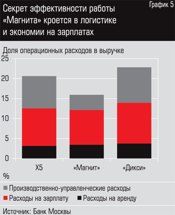 Усовершенствование логистики стало важнейшей составной частью стратегии по оптимизации затрат, в результате которой у «Магнита» самые лучшие показатели по операционным издержкам (см. график 5). На квадратный метр торговой площади «Магнит» тратит всего 1188 рублей против 2470 рублей у «Пятерочки» и 2590 рублей у «Дикси». «Этих показателей удалось достичь в том числе и за счет улучшения логистики, сокращения расходов на персонал и аренду недвижимости», — считает Сабина Мухамеджанова. Действительно, затраты на персонал в небольших городах ниже, чем в мегаполисах, и если X5 и «Дикси» тратят на зарплаты 9,4 и 10,2% от выручки соответственно, то «Магнит» ограничивается 8,7%.