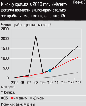 Будучи более прибыльными, чем «магазины у дома», гипермаркеты могли бы закрепить успех «Магнита» в прибыльности, достигнутый им в кризис. Так, согласно прогнозам Сабины Мухамеджановой, в 2010 году чистая прибыль «Магнита» и X5 сравняется, что показывает явное преимущество «Магнита», у которого оборот в полтора раза меньше. Но по окончании кризиса, где-то с 2011 года, аналитик Банка Москвы предрекает уход потребителя из дешевых универсамов в супермаркеты и в связи с этим возвращение лидерства к X5 (см. график 6). «Конец кризиса вновь отдаст преимущество экстенсивно развивающимся компаниям», — считает Сабина Мухамеджанова. Правда, возникает вопрос, насколько быстро после кризиса супермаркеты — российские и западные — смогут появиться в райцентрах. Вот, например, в Москве недавно открылся Carrefour. О приходе этой сети в столицу говорили давно, еще три года назад Сергей Галицкий по этому поводу сказал: «А когда в Старонижнестеблевской будет Carrefour? Если учесть, что мне осталось жить в лучшем случае сорок лет, для меня — никогда».