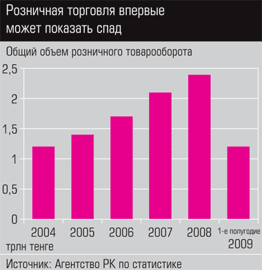 В эпоху кризиса идеология потребления уступает место привычке экономить. Если верить официальной статистике, то реальные денежные доходы населения выросли в первом полугодии 2009 года на 0,7% по сравнению с аналогичным периодом прошлого года. Но при этом расходы населения сократились. В период экономических неурядиц люди предпочитают скидывать с парохода семейного бюджета второстепенные статьи расходов. В первую очередь это касается приобретения товаров народного потребления. По данным Агентства РК по статистике, объем розничного товарооборота за первое полугодие 2009 года сократился на 10% по сравнению с первым полугодием прошлого года и составил 1218 млрд тенге. По мнению специалистов агентства, наибольшее падение продаж произошло в непродовольственном ретейле, в частности, в сегменте бытовой техники и мебели. Структура падения спроса одинакова практически во всех секторах розничной торговли - наибольший отток потребителей произошел в верхнем ценовом сегменте.