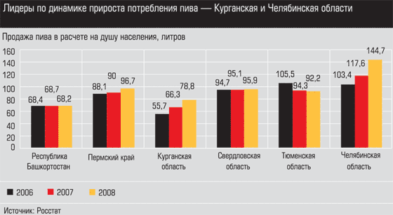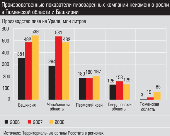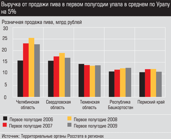2009?й начался для пивоваров с серьезного падения. В первом полугодии объем продаж пива в натуральном выражении в среднем по стране сократился на 7%. Уральская статистика отличается большим разбросом показателей: лидеры падения — Свердловская область и Пермский край (11 и 10% соответственно), в Башкирии и Тюменской области, наоборот, наметился подъем (1,3 и 4%).