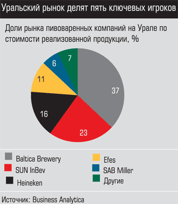 93% пивоваренного рынка Урала делят между собой пять транснациональных компаний, обладающих большим запасом финансовой прочности: Baltica Brewery (владеет заводом в Челябинске), Sun InBev (российское подразделение американо-бельгийского концерна «Анхойзер-Буш ИнБев», завод в Перми), Heineken (Голландия, собственник завода «Патра» в Екатеринбурге и комбината «Шихан» в Стерлитамаке), Efes Breweries International (Турция, владеет заводом «Амстар» в Уфе) и SAB Miller (Сальвадор, активов на Урале не имеет).