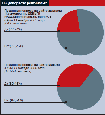 Рейтинги надежности банков востребованы и сейчас, хотя эту довольно расплывчатую характеристику в принципе нельзя вывести из финансовых или любых других показателей. Популярный сайт Banki.ru пошел другим путем: его народный рейтинг собирает отзывы клиентов банков о качестве обслуживания. "Приветствуются любые отзывы, основанные на личном опыте. Пожалуйста, воздержитесь от попыток искусственно очернить/обелить тот или иной банк",— предупреждает сайт. "Для нас рейтинг — абсолютно некоммерческий проект,— заверяет руководитель направления интерактивных сервисов и спецпроектов Banki.ru Вадим Пикулин.— Он таким и должен быть, иначе перестанет привлекать интерес пользователя. Отзывов в народный рейтинг идет около 30-40 в день. В кризис их количество увеличилось до 100". Пропорционально увеличивается и ежедневное количество посещений сайта: до кризиса было около 40 тыс. посетителей, к декабрю 2008-го это число выросло до 90 тыс.