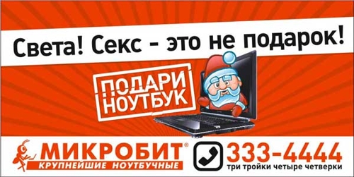 В конце 2005 года питерская сеть магазинов электроники «Микробит» зазывала покупателей в свои магазины плакатами вот с таким текстом: «Света! Секс — не подарок! Подари ноутбук!» Руководство «Микробита» посчитало эту рекламную кампанию успешной, так как уже за первые две недели после ее выхода объем продаж вырос на 23% по сравнению с аналогичным периодом прошлого года. Причина народной любви к откровенно плоской и пошлой рекламе, возможно, кроется в необычайно быстром прохождении этапов формирования нового потребительского общества.