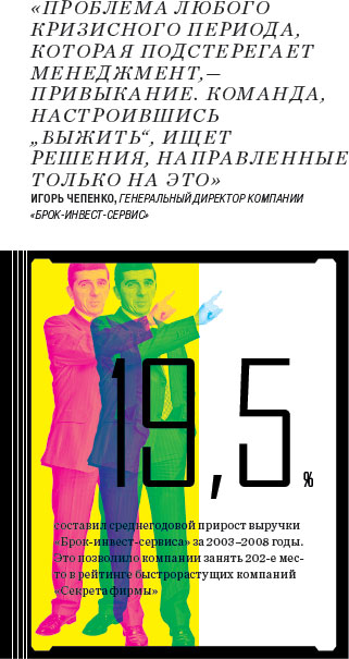 Вот что говорит генеральный директор компании "Брокинвестсервис" Игорь Чепенко: "Проблема любого кризисного периода, которая подстерегает менеджмент,— привыкание. Команда, настроившись на задачу "выжить", ищет решения, направленные только на это. В итоге каждый честно делает свое дело в своем подразделении, где уже минимум персонала, расходов, и голова руководителя на 100% занята только мыслями о пассивном спасении".