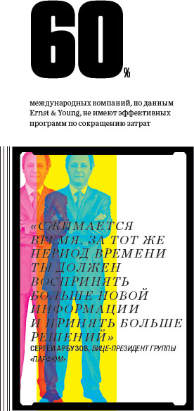 "Сжимается время. Это значит, что в тот же период ты должен воспринять больше новой информации и принять больше решений, чем раньше,— констатирует вице-президент группы "Парфюм" Сергей Арбузов.— Еще тяжелее менять темп жизни сотрудников. Это я не про лишний час работы". Например, чтобы ускорить принятие решений, в компании ввели новый порядок. Раньше планы с конкретными показателями разрабатывали на год, соответственно, вся система отчетности и обмена информацией строилась помесячно. Теперь план разрабатывают на квартал, на год готовится лишь прогноз. Данные о закупках и продажах собирают и анализируют уже раз в неделю. В несколько раз увеличились и скорость обмена внутренней информацией между предприятиями группы из разных регионов, и частота совещаний на самом высоком уровне.