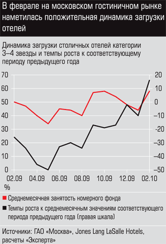 На московском гостиничном рынке заметны признаки оживления. Загрузка отелей начала расти впервые после прошлогоднего спада. По информации ГАО «Москва», гостиницы категории три-четыре звезды в феврале были заполнены на 58% (прирост около 15% к аналогичному периоду прошлого года). Растет спрос на дешевые отели уровня одна-две звезды. Участники рынка утверждают, что постепенно восстанавливается турпоток, в том числе командировочный оборот. Не оправдались прогнозы о резком схлопывании въездного туризма. Согласно данным Погранслужбы ФСБ, РЖД и судоходных компаний, въездной туризм по итогам 2009 года сократился только на 9,7%.