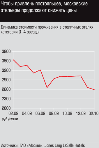 Из-за сокращения турпотока (в первом квартале 2009?го он поредел на 20%) и ослабления деловой активности столичные отели были вынуждены снижать цены. По словам старшего вице-президента компании Jones Lang LaSalle Hotels Марины Смирновой, наиболее гибкими в этом плане оказались крупные международные операторы. Некоторые из них быстро реагировали на изменения спроса и смогли обеспечить 60–65?процентную загрузку качественных сетевых отелей даже в кризис. Как замечает гендиректор компании Hotel Consulting & Development Group Александр Лесник, у операторов была возможность легко манипулировать ценами, поскольку о реальной себестоимости услуг управляющих компаний собственники отелей имеют весьма смутное представление.