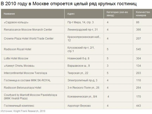 Если до кризиса в Москве открывались преимущественно нишевые дорогие отели с небольшим номерным фондом, то в этом году ситуация может кардинально измениться. Сдаются в эксплуатацию вместительные отели, такие как Radisson Royal Hotel (545 номеров) — бывшая «Украина» на Кутузовском проспекте; Renaissance Moscow Monarch Center (366 номеров) на пересечении Ленинградского шоссе с Третьим транспортным кольцом; Lotte Hotel Moscow (304 номера) в Lotte Plaza на Новинском бульваре; Intercontinental Moscow Tverskaya — бывшая гостиница «Минск» на Тверской улице; Courtyard by Marriott Moscow Paveletskaya на Кожевнической улице; Mercure на Смоленской площади.
