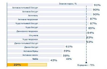 В целом, знание марки Velle существенно уступает конкурентам (Диаграмма 2), однако в группе вовлеченных в акцию показатель знания марки приближается к уровню инновационных молочных продуктов. Это можно считать хорошим результатом, учитывая мощную рекламную поддержку таких брендов как Activia, Чудо, Danone.