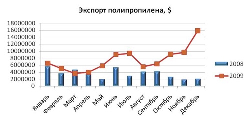 В группе пластмасс есть уникальный товар, темпы экспорта которого достигли абсолютного рекорда: коэффициент активности КА составил 8,3 (график 1). Если учесть, что денег на этом рынке водится просто немерено, то возникает чувство большого уважения к соотечественникам за такую стратегию экспортной торговли. Мы уже привыкли, что китайские товары рекой текут в наши края, тут же обратный случай – река полипропилена потекла в Китай. Ну а достаточно большие ручьи направились на Украину, Казахстан, Узбекистан и Турцию. Все просто. Если поблизости сбыт отсутствует, его находят у соседей. Лишь бы товар не подкачал.