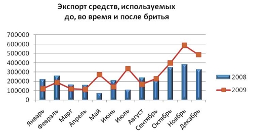 названий типа «Орифлэйм», «Фаберлик», «Ориаль» и «Эйвон» гордо звучит отечественный бренд «Концерн Калина», занимающий уже 27% экспортного рынка средств для макияжа губ и 25% экспорта средств для бритья (график 5). Ну а по продаже средств для гигиены полости рта свердловское предприятие уже стало небожителем со своими 74% рынка.