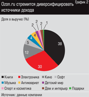Так, в традиционных для интернет-ритейла и потому высококонкурентных товарных нишах компания делает крен в сторону уникальной продукции. Например, книжный ассортимент Ozon.ru насчитывает более 400 тыс. изданий, или около 90% текстов, когда-либо издававшихся в России, и приносит 38% оборота (см. график 2).