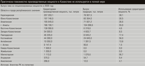 В основном пиво производят в Карагандинской, Костанайской. Павлодарской, Южно-Казахстанской областях и в Алматы. При этом Казахстан пока довольно слабо использует свои производственные мощности. Среднегодовая производственная мощность предприятий, действовавшая в 2009 году, составила 1,1 млрд литров, а было произведено лишь 33% этого объема. Чаще всего это происходит по причине устаревшего оборудования. В городе Алматы, который является лидером по выпуску продукции, мощности используются только на 55%. Наиболее полно свои мощности используют компании Efes и Carlsberg, где уровень загрузки, как правило, составляет 80—90%.