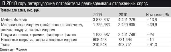 В отличие от многих других категорий потребительских товаров, рынок товаров для дома (так называемый формат Homelife market – мебель и аксессуары для дома) выглядит ненасыщенным и перспективным. По официальной статистике, 2010 год для большинства категорий этого рынка оказался периодом скачка продаж. К примеру, в Санкт-Петербурге продажи металлических изделий хозназначения выросли почти на 40%, тканей – на 90% и т.д.