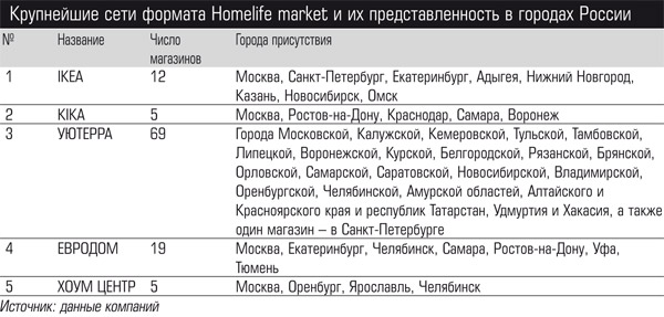 В Петербурге количество сетей, специализирующихся исключительно на товарах для дома, невелико. Причем далеко не у всех дела идут успешно: достаточно вспомнить банкротство сети «Санта-Хаус» в 2008 году. Видимо, учитывая этот печальный опыт, многие федеральные игроки (например, сеть «Хоум центр» или австрийская Kika) предпочитают обходить Северную столицу стороной, активно развиваясь в Москве и других регионах. В то же время есть и особо смелые, например в прошлом году на местный рынок вышла федеральная сеть «Уютерра». Однако пока она ограничивается одним магазином в Петербурге, при том что общее число ее точек приближается к 70.