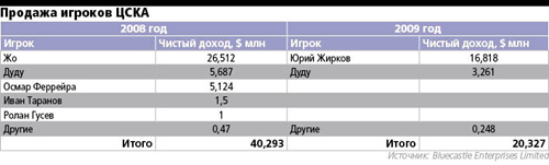 Есть в финансовом отчете и более конкретная информация, например, подробности сделок ЦСКА с точностью до тысяч долларов (см. таблицу). Рекордный трансфер бразильца Жо в Manchester City стоил $37,85 млн (с учетом интереса третьих сторон). Если по Жо поступления пришли единоразово, то по трансферу Дуду, видимо, деньги поступали партиями. Всего в 2008 году ЦСКА заработал на продаже игроков $40,3 млн. В 2009 году эта сумма сократилась вдвое, до $20,3 млн.