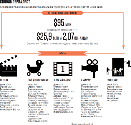 Весной 2010 года Александр Роднянский выкупил у Олега Чамина (владелец сети "Настроение") контрольный пакет компании "Кино без границ". Ее оборот оценивается в $3-4 млн. Ключевой актив — библиотека из более чем 1,5 тыс. зарубежных авторских картин. Спустя год Роднянский получил контроль над немецкой A Company, которая занимается производством кино и покупкой прав на популярные западные фильмы. В России работает ее "дочка" "Гала медиа". Собственная библиотека A Company насчитывает более 500 голливудских фильмов. Именно эта компания будет заниматься дистрибуцией новых фильмов Роднянского в Европе. Кроме того, он ведет переговоры по приобретению дистрибуторов в США и Азии.