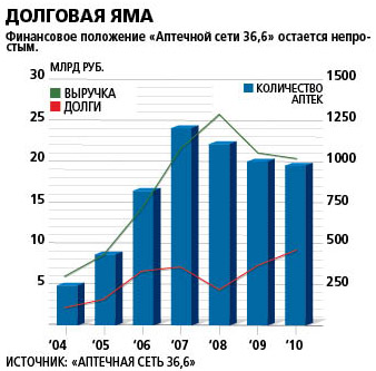 В 2003 году у «36,6» было 60 аптек в столице и одна за ее пределами. Бектемиров и Кривошеев провели первичное размещение 20% акций компании на ММВБ — редкое по тем временам событие (в 2007 году последовало еще одно размещение). «Их схема развития была похожа на пирамиду МММ, — рассказал Forbes топ-менеджер одной из дистрибьюторских компаний. — Оборот растет, под это дают займы. На займы открываются новые аптеки, выручка увеличивается, берутся новые кредиты и т. д.». Банки не скупились на займы амбициозному бизнесу. Экспансия «36,6» была в буквальном смысле ураганной. За 2005–2007 годы компания скупила почти 800 провинциальных аптек и открыла более 300 новых аптек в Москве и регионах. У нее появились непрофильные проекты — сеть магазинов детских товаров и Европейский медицинский центр (ЕМЦ). В 2007 году при выручке 21,6 млрд рублей и долгах 7,2 млрд рублей «Аптечная сеть 36,6» впервые за шесть лет показала убыток.