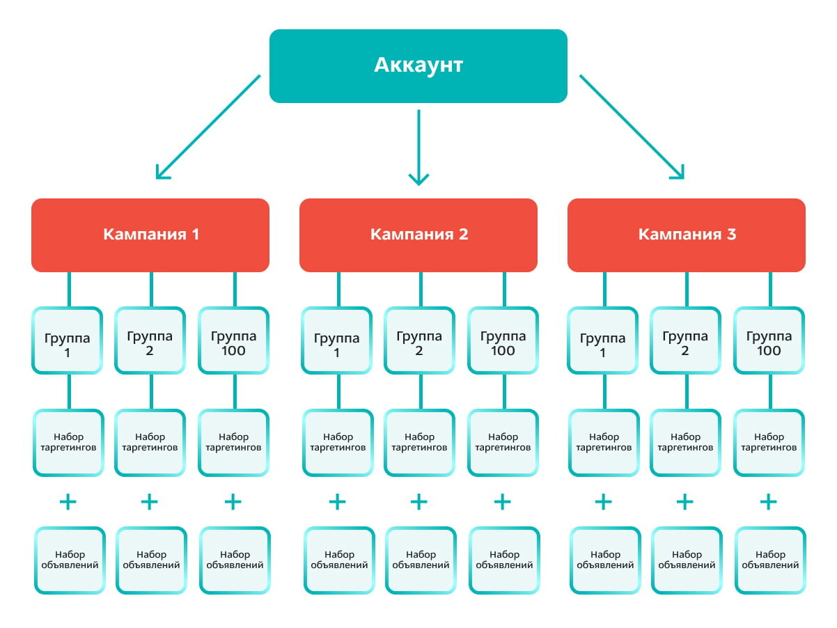 Структура рекламного кабинета — это то, из каких кампаний, групп объявлений, ключевых фраз и других таргетингов он состоит.