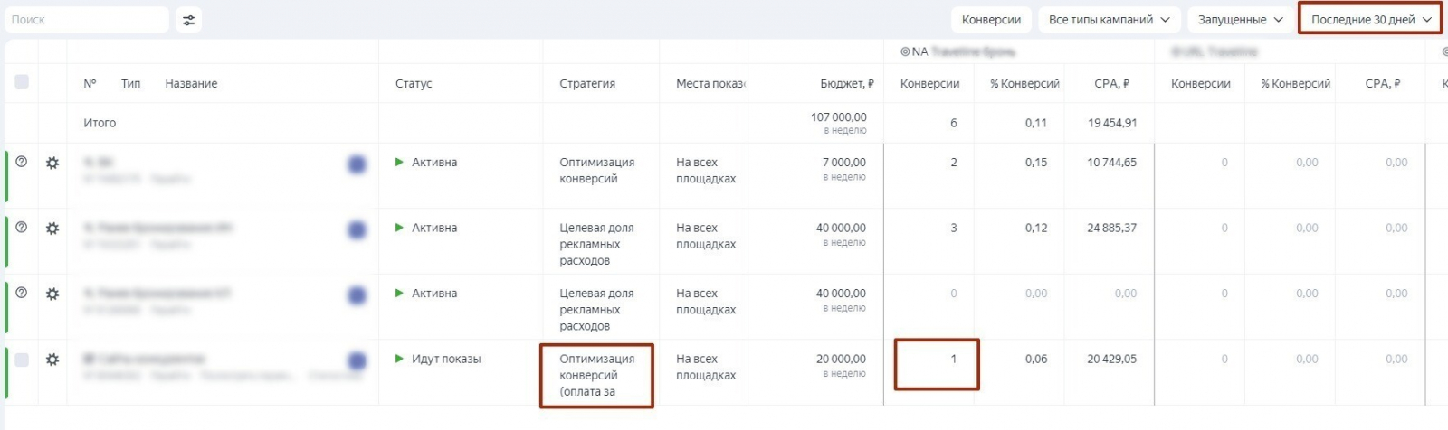 РК находится под управлением автостратегии «Максимум конверсий» с оплатой за достижение цели «Бронирование» (те, кто забронировал проживание). Из статистики видно, что системе не хватает данных для обучения. Единственный лид, который кампания принесла за 30 дней, обошелся клиенту в 20 429 руб. При этом в настройках стратегии установлен целевой показатель CPA = 1 000 руб. Разумеется, в подобной ситуации автостратегия не будет работать.