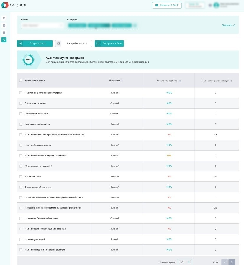 На платформе Origami мы реализовали специальный инструмент, который помогает найти ошибки в рекламных кампаниях на поиске и в РСЯ. Его используют все специалисты нашего агентства, также он доступен и для клиентов платформы.