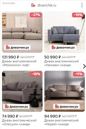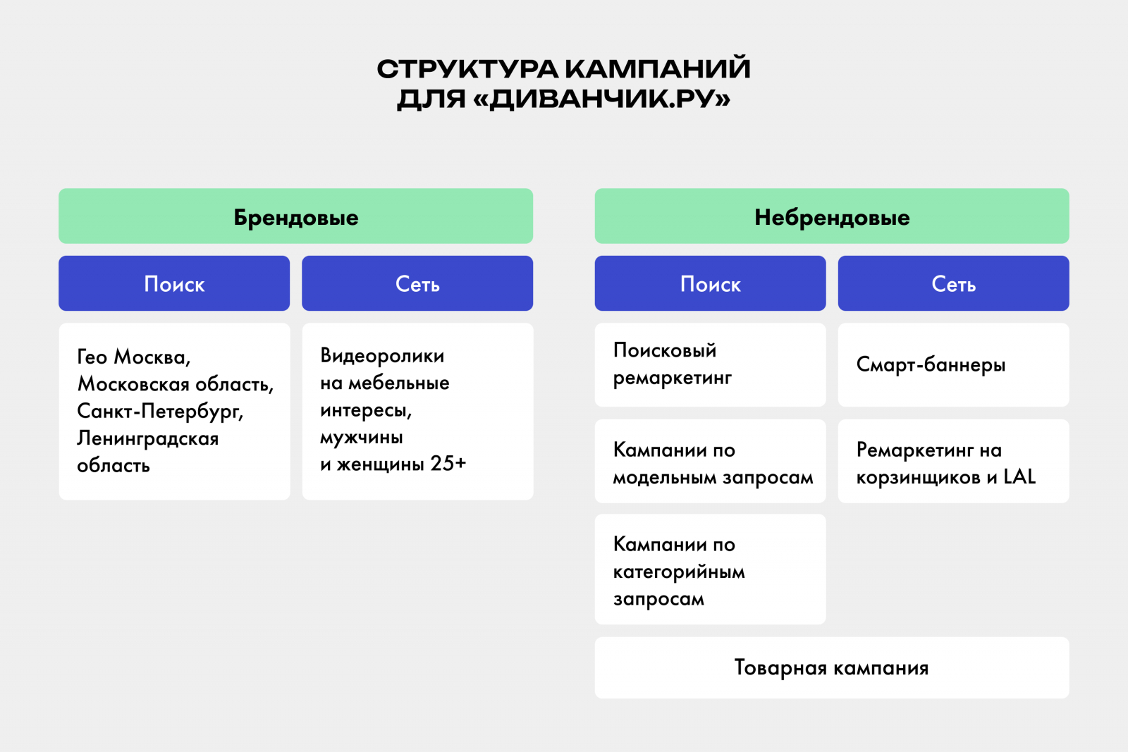 До обращения в i-Media «Диванчик.ру» у нас уже были клиенты из мебельной сферы. Несмотря на имеющийся опыт, нам было важно протестировать кампании, чтобы оценить, какие из них будут эффективно работать конкретно в этом проекте. Есть множество факторов, которые влияют на итоговую эффективность: от узнаваемости бренда и УТП, до степени проработки сайта и стоимости товаров, поэтому универсального решения для всех проектов тут нет и не может быть.