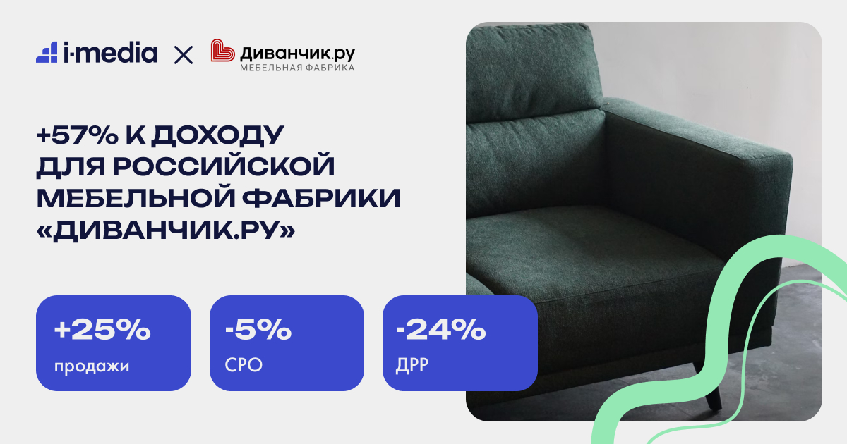 «Диванчик.ру» — российская фабрика по производству стильных и качественных диванов. Компания была основана в 2006 году и прошла путь от небольшой мастерской до крупного производителя. В ноябре 2022 года «Диванчик.ру» обратились в i-Media с задачей нарастить объем продаж с сохранением CPO в рамках KPI. Через три месяца работы мы утроили количество покупок с сохранением СРО, а в динамике год к году 2024 к 2023 увеличили доход компании на 57%. Дальше расскажем, что для этого сделали.