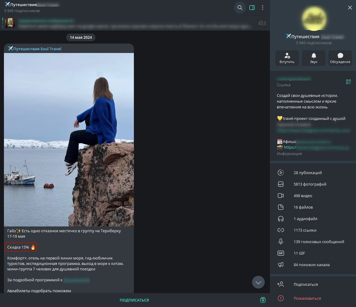 При выборе каналов для рекламы отеля казалось логичным сосредоточиться на сообществах о путешествиях и отдыхе. Однако мы обнаружили, что большинство таких каналов ориентированы на массового туриста: горящие туры, скидки, акции на выходные. Их аудитория не готова к ценам luxury-отеля.