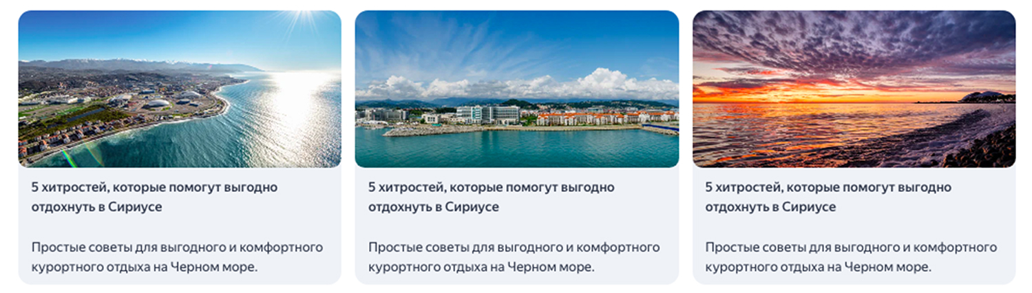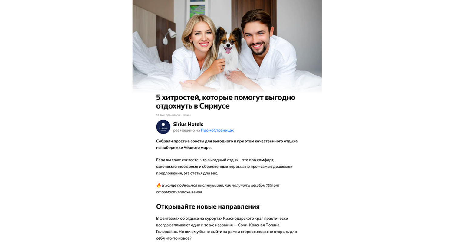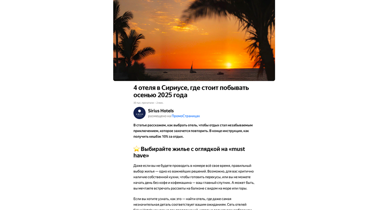 Мы занимаемся комплексным продвижением сети черноморских отелей Sirius Hotels, используя разнообразные рекламные инструменты. «ПромоСтраницы» открывают воронку продаж: они позволяют выйти на потенциально заинтересованных пользователей, подробно рассказать об инфраструктуре отелей и мягко подвести к конверсии. «ПромоСтраницы» демонстрируют отличные результаты во многом благодаря информативности лонгридов и длительному контакту с аудиторией. Поэтому перед нами стоит задача не только регулярно выпускать новые материалы, но и масштабироваться, улучшая результаты прошлых рекламных кампаний.