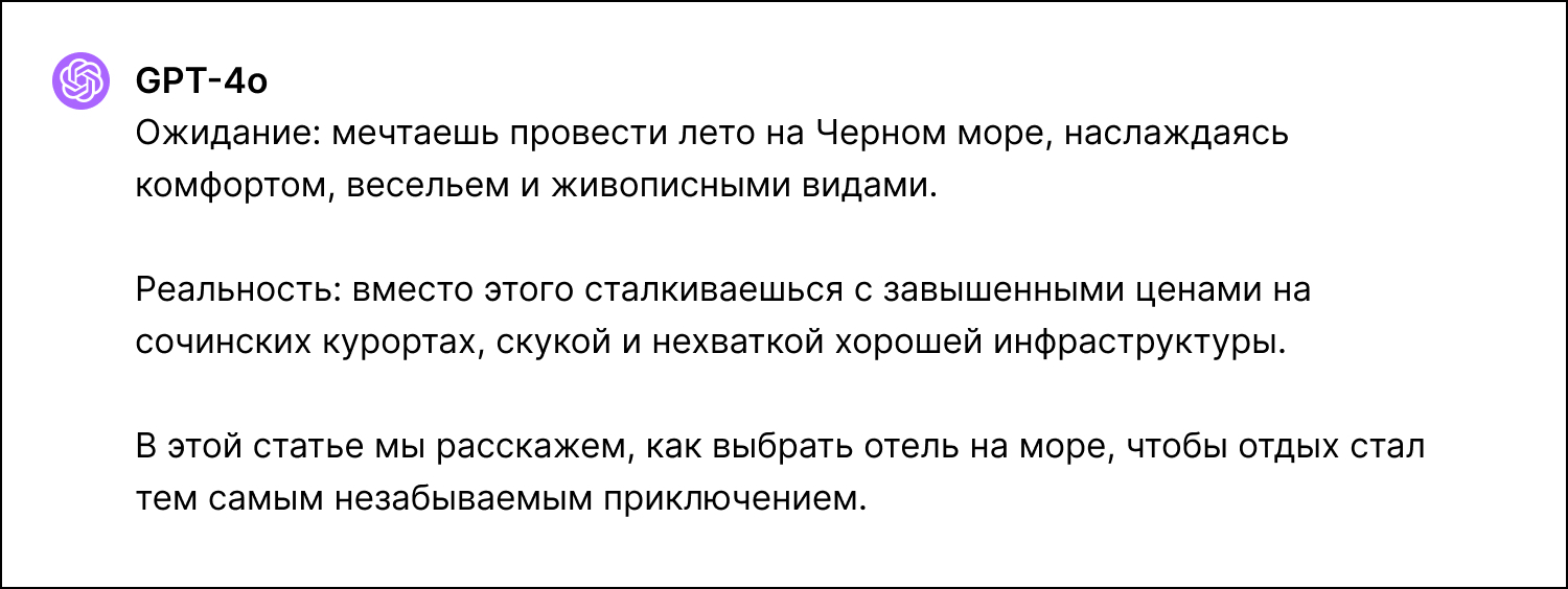 Во время создания очередного материала о сети отелей мы решили попробовать комплексный подход: в сердце статьи использовать уже опубликованный материал с хорошими показателями, для уточнения деталей предоставлять ChatGPT отрывки из другой рабочей статьи и контролировать работу ИИ при создании каждого смыслового блока. За техническую основу взяли промты из обучения «ПромоСтраниц» «6 шагов к тексту от AI».