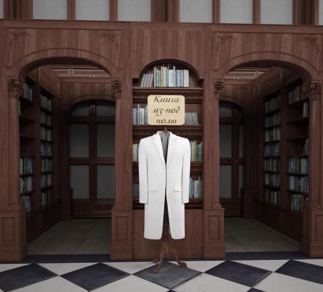 А вот и книжный стенд Никиты Шервуда: "Книга из-под полы". Роман под пальто, в специальных кармашках на стойке. Народ подходит, распахивает и вытаскивает. Нарочитый плакатик остался, конечно, только в компьютерном макете: на деле всё написали угольным карандашиком на картонке (что-то вроде большого ценника) и подвесили к рукаву.