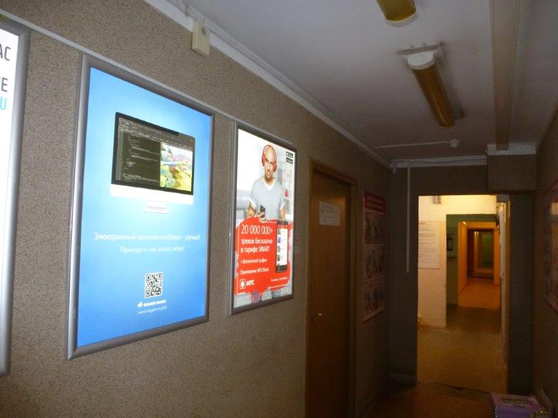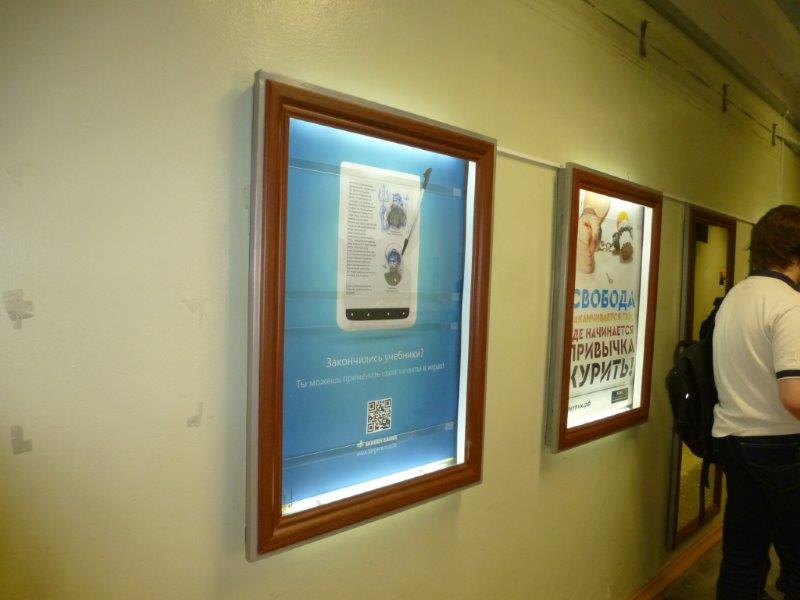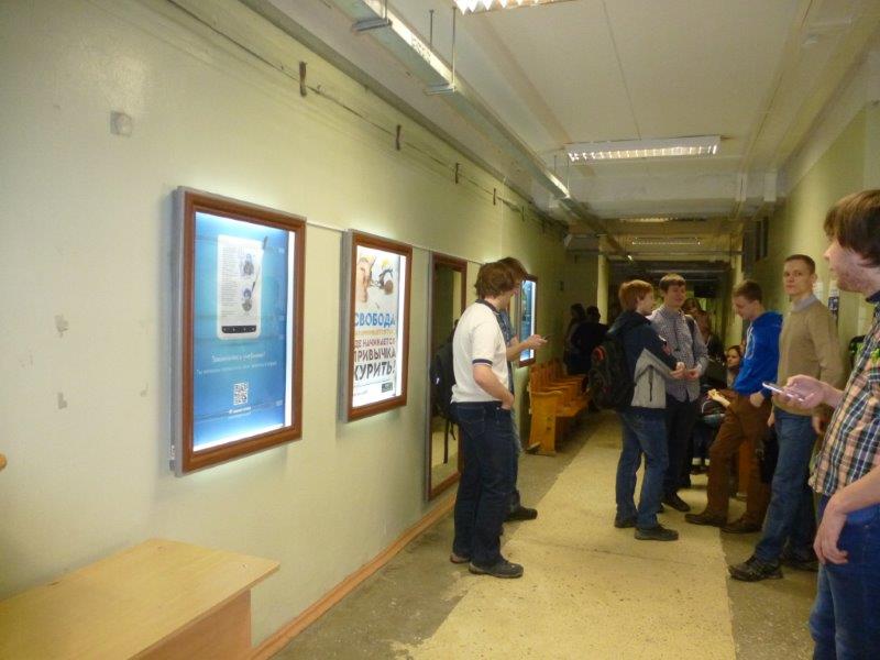 Размещение рекламных постеров осуществлено в наиболее проходимых зонах учебных заведений – холлы, входы в главный учебный корпус. В кампании задействованы только световые носители – лайтбоксы.